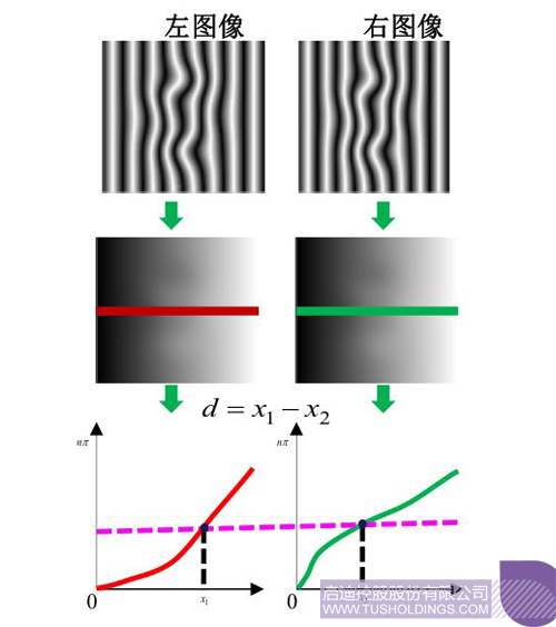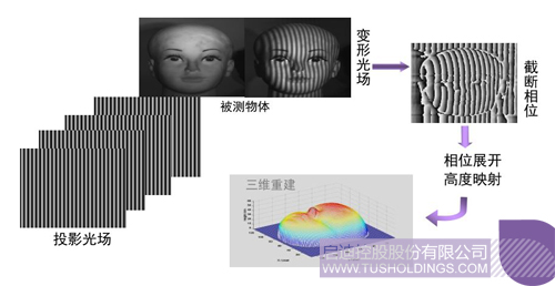 結(jié)構(gòu)光條紋(單幀條紋或相移條紋)投影到被測物體表面,從另一方向觀察到變形條紋,通過計算變形條紋的相位,得到截斷相位,展開成連續(xù)相位,根據(jù)相位和高度的映射關系,重建被測物體的三維面形數(shù)據(jù)。
