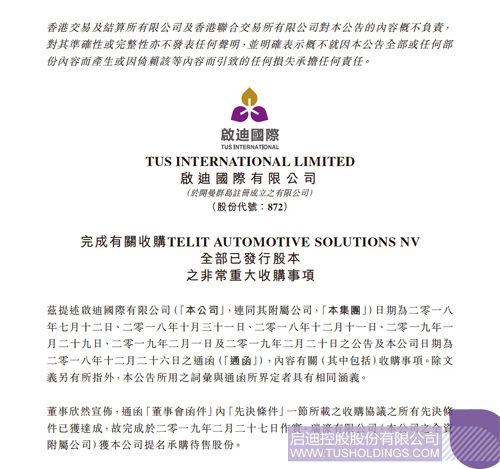 2019年2月27日,啟迪國際有限公司(股票代碼: 872.HK,以下簡稱“公司”或“啟迪國際”)發(fā)布公告:公司連同其附屬公司收購Telit車載通訊業(yè)務之所有先決條件已獲達成,正式完成收購,目標公司及其附屬公司成為啟迪國際的全資子公司。在此之前的2018年7月12日,啟迪國際宣布以1.05億美元(約8.24億港元)收購Telit車載通訊業(yè)務,進一步強化集團智能駕駛系統(tǒng)業(yè)務布局。