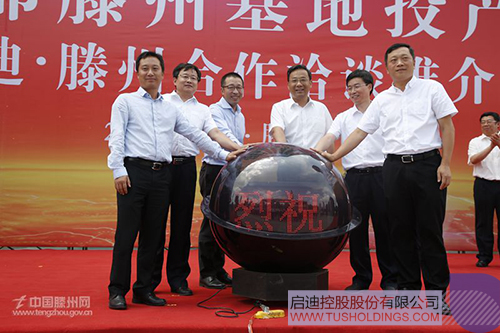 會上,邵士官、王書貴、馬曉偉、張延偉、龍林,共同為啟迪亞都滕州公司投產(chǎn)啟動水晶球。