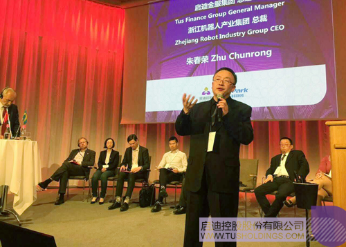 ▲ 啟迪金服總經(jīng)理、浙江機器人產(chǎn)業(yè)集團總經(jīng)理朱春榮在瑞典諾貝爾頒獎大廳演講