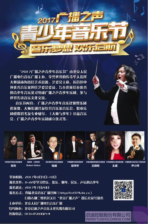 啟迪之聲與北京人民廣播電臺音樂廣播聯(lián)袂創(chuàng)辦了國內(nèi)首個(gè)青少年音樂節(jié)——“2017廣播之聲青少年音樂節(jié)”,音樂節(jié)由獲格萊美獎、享譽(yù)世界的傳奇華人指揮大師湯沐海出任藝術(shù)總監(jiān)、藝委會主席,聘請國內(nèi)外超過100位優(yōu)秀的音樂家擔(dān)任藝委會委員,通過音樂比賽、大師集訓(xùn)營、駐營音樂家音樂會、《大師與少年》音樂盛典等一系列活動,選拔培養(yǎng)優(yōu)秀的青少年音樂英才組成樂團(tuán),參與世界先進(jìn)音樂文化交流。