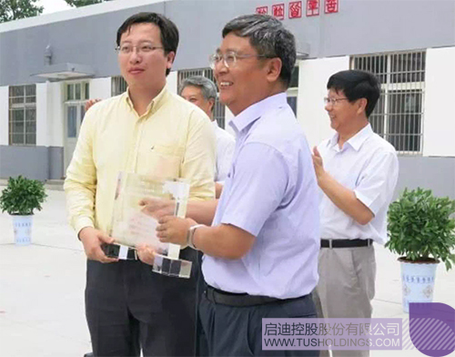 阜寧縣教育局局長蔡衛(wèi)國向啟迪控股代表贈送“啟迪樓”模型