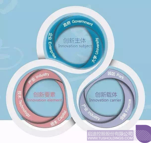 啟迪控股在多年的科技服務(wù)實踐中,以創(chuàng)新為基點,以產(chǎn)業(yè)為抓手,提煉出“創(chuàng)新主體:政府+企業(yè)+大學(xué),創(chuàng)新載體:園區(qū)+實業(yè)+金融,創(chuàng)新本體:技術(shù)+產(chǎn)業(yè)+資本”三個三螺旋多重交織的立體三螺旋模型,成為科技創(chuàng)新和產(chǎn)業(yè)升級的重要驅(qū)動。在此基礎(chǔ)上,把立體三螺旋模式與啟迪控股巨大的創(chuàng)新平臺網(wǎng)絡(luò)和啟迪控股匯聚的各路精英團隊相結(jié)合,形成新的三合一,這就是啟迪控股創(chuàng)造與實踐的“集群式創(chuàng)新”理論。