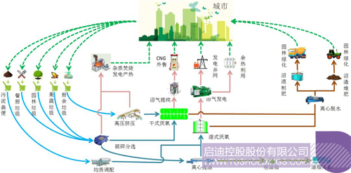 啟迪桑德針對各類城市濕垃圾的特點(diǎn),成功的開發(fā)了“垃圾干濕分離”、“干法/濕法厭氧”、“沼渣處理”、“沼氣凈化與利用”、“沼液處理”等多項(xiàng)核心技術(shù),建立了城市濕垃圾處置與資源化利用綜合解決方案。通過處理,城市濕垃圾能夠被轉(zhuǎn)化為沼氣、沼渣、沼液和殘?jiān)葞追N產(chǎn)品。沼氣可作為清潔能源被廣泛利用,如制取壓縮天然氣、熱電聯(lián)產(chǎn)或作為直接作為燃?xì)獾?。沼渣和沼液可以作為有機(jī)肥,回用于市政綠地及園林。殘?jiān)赏馑屠贌龔S處置,產(chǎn)生電能。