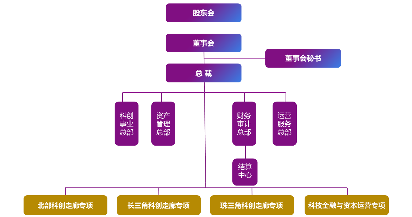四個總部:科創(chuàng)事業(yè)總部、資產(chǎn)管理總部、財務審計總部、運營服務總部四個業(yè)務專項:北部科創(chuàng)走廊專項、長三角科創(chuàng)走廊專項、珠三角科創(chuàng)走廊專項、科技金融與資本運營專項
