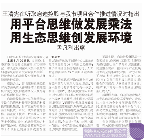 青島日報6月21日頭版報道: 19日晚,省委常委、市委書記王清憲,市委副書記、市長孟凡利在八大關(guān)小禮堂與啟迪三螺旋研究院院長彭頃砡一行就我市與啟迪控股全面合作進展情況進行座談。