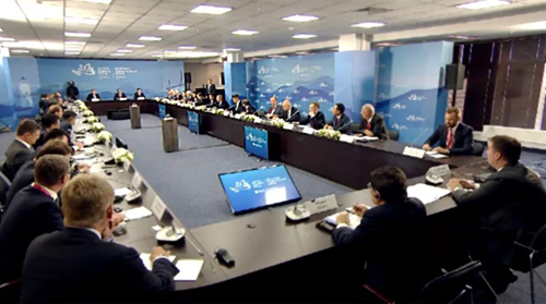 2018年9月11日,俄羅斯第四屆東方經(jīng)濟(jì)論壇在遠(yuǎn)東城市符拉迪沃斯托克舉辦。當(dāng)日下午,由論壇主辦方邀請(qǐng)的中外企業(yè)家代表參加了與普京總統(tǒng)的座談會(huì)。王濟(jì)武董事長(zhǎng)應(yīng)邀出席,并與其他五位中外企業(yè)家在座談會(huì)上發(fā)言。
