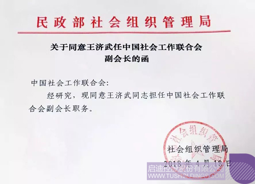 2018年4月,民政部社會(huì)組織管理局復(fù)函中國(guó)社會(huì)工作聯(lián)合會(huì),同意王濟(jì)武同志擔(dān)任中國(guó)社會(huì)工作聯(lián)合會(huì)副會(huì)長(zhǎng)職務(wù)。此任命經(jīng)中國(guó)社會(huì)工作聯(lián)合會(huì)宮蒲光會(huì)長(zhǎng)提名,中國(guó)社會(huì)工作聯(lián)合會(huì)黨委會(huì)決定。