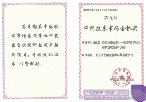 2018年10月,第九屆中國(guó)技術(shù)市場(chǎng)協(xié)會(huì)金橋獎(jiǎng)?lì)C獎(jiǎng)大會(huì)在北京舉行,啟迪清蕓 “監(jiān)控診斷運(yùn)維一體化智能光伏電站系統(tǒng)”(SOLARULE系統(tǒng))斬獲中國(guó)技術(shù)市場(chǎng)金橋獎(jiǎng)項(xiàng)目突出貢獻(xiàn)獎(jiǎng),并在同類獎(jiǎng)項(xiàng)中名列第一。