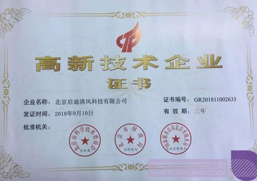 2018年9月,啟迪清風(fēng)榮獲北京市科學(xué)技術(shù)委員會(huì)、北京市財(cái)政局、北京市稅務(wù)局頒發(fā)的“高新技術(shù)企業(yè)證書”。