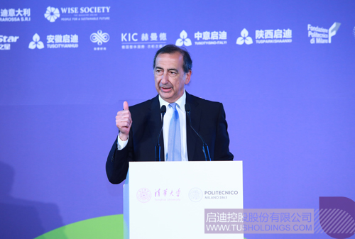 清華大學(xué)黨委書記、校務(wù)委員會主任陳旭出席并致辭。中國駐米蘭領(lǐng)事館總領(lǐng)事宋雪峰,米蘭市市長朱塞佩·薩拉,米蘭理工大學(xué)校長費盧奇奧·內(nèi)斯塔、副校長朱利亞諾·諾齊,有“意大利后現(xiàn)代主義設(shè)計之父”之稱的意大利當(dāng)代著名設(shè)計師、建筑家及設(shè)計批評家亞歷山德羅·門迪尼(Alessandro Mendini),清華大學(xué)校務(wù)委員會副主任韓景陽,清華大學(xué)美術(shù)學(xué)院院長魯曉波,中國工業(yè)和信息化部國際經(jīng)濟(jì)技術(shù)合作中心主任鄭紅,啟迪控股總裁袁桅等出席儀式。中意兩國各界代表300余人共同見證了這一歷史性時刻。