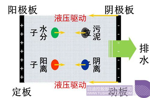 電滲透污泥高干脫水設(shè)備由電滲透系統(tǒng)、濾室組件、液壓系統(tǒng)等組成。污泥經(jīng)進(jìn)泥泵輸送到濾室,陰、陽(yáng)極板通電后形成均布電場(chǎng),在電場(chǎng)作用下,污泥中的帶電粒子分別向陰、陽(yáng)極板移動(dòng),并結(jié)合液壓系統(tǒng)帶動(dòng)板框梯度壓榨,實(shí)現(xiàn)污泥脫水。