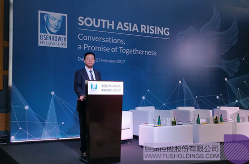 為了讓世界各國,特別是來自南亞地區(qū)國家的代表更深入地了解中國政府所推行的“一帶一路”倡議,美國艾森豪威爾基金會出資邀請啟迪控股常務(wù)副總裁陳鴻波赴迪拜出席主題為“對話,團(tuán)結(jié)的意愿”的“南亞崛起”峰會,并特別安排其在開幕式后全體會議上第一個發(fā)言。來自美國、加拿大、澳大利亞、阿聯(lián)酋、納米比亞、南非、坦桑尼亞、幾內(nèi)亞、肯尼亞、英國、緬甸、愛爾蘭、孟加拉以及南亞六國等40多個國家的政府、學(xué)校、研究機構(gòu)以及產(chǎn)業(yè)界的代表近200人出席了會議。巴基斯坦前總統(tǒng)穆沙拉夫、艾森豪威爾基金會主席等重要嘉賓出席開幕式。